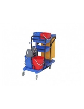 Las ruedas en el Carro de Limpieza Multifuncion hacen que sea fácil de mover, lo que es especialmente útil al navegar por grandes áreas. Estas ruedas permiten un desplazamiento suave y una maniobrabilidad eficiente. Además, el color azul distintivo no solo agrega un toque de estilo, sino que también facilita la identificación del carro en el entorno de trabajo.