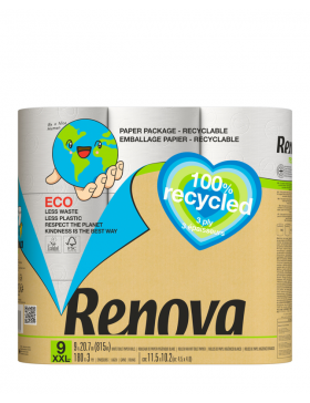 Papel higiénico blanco 100% reciclado, envuelto en embalaje de papel reciclable, rápidamente biodegradable y de alta calidad